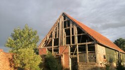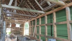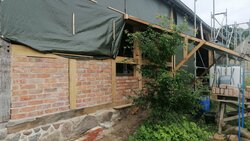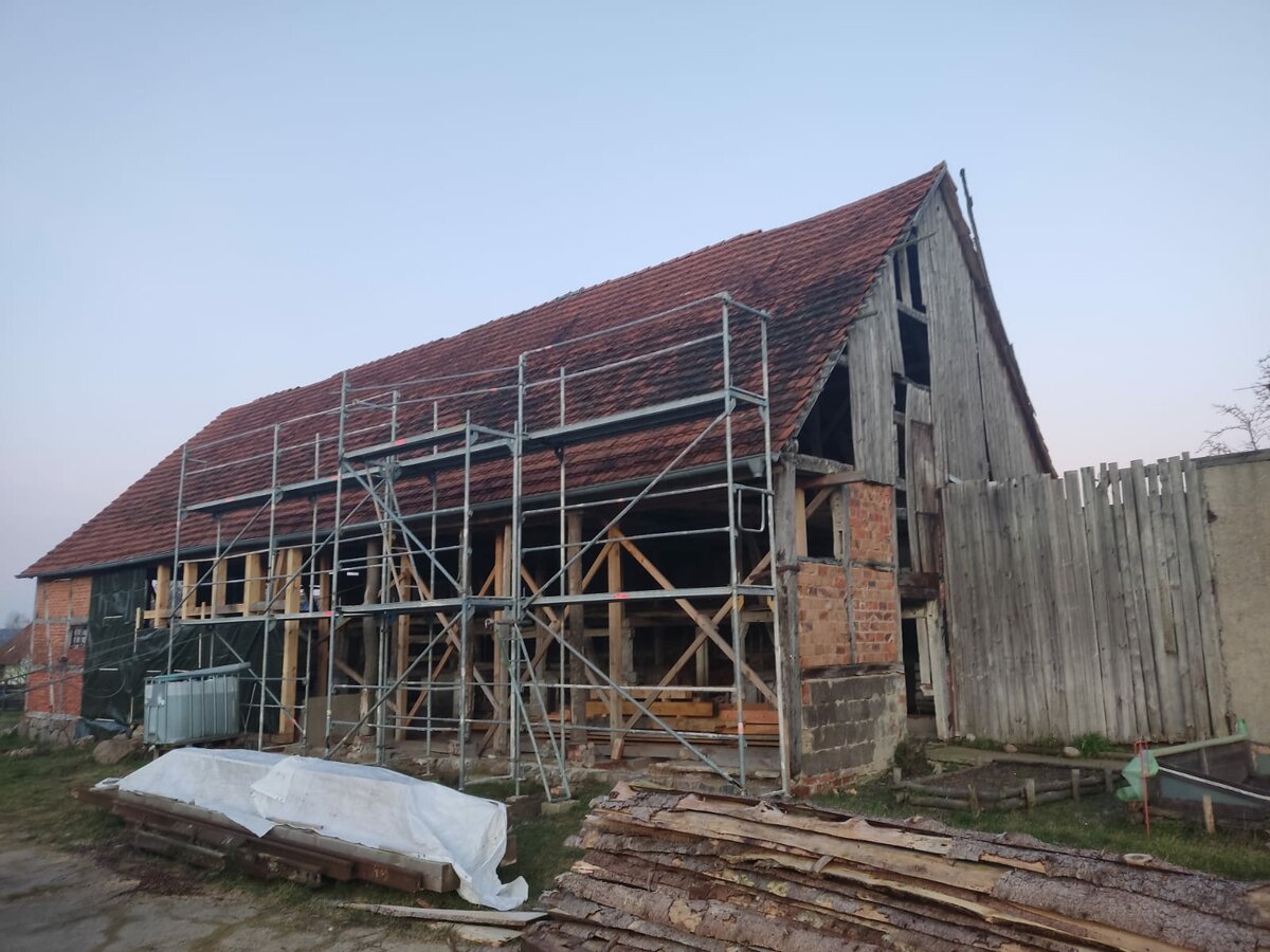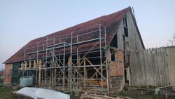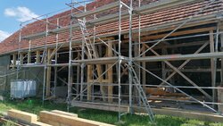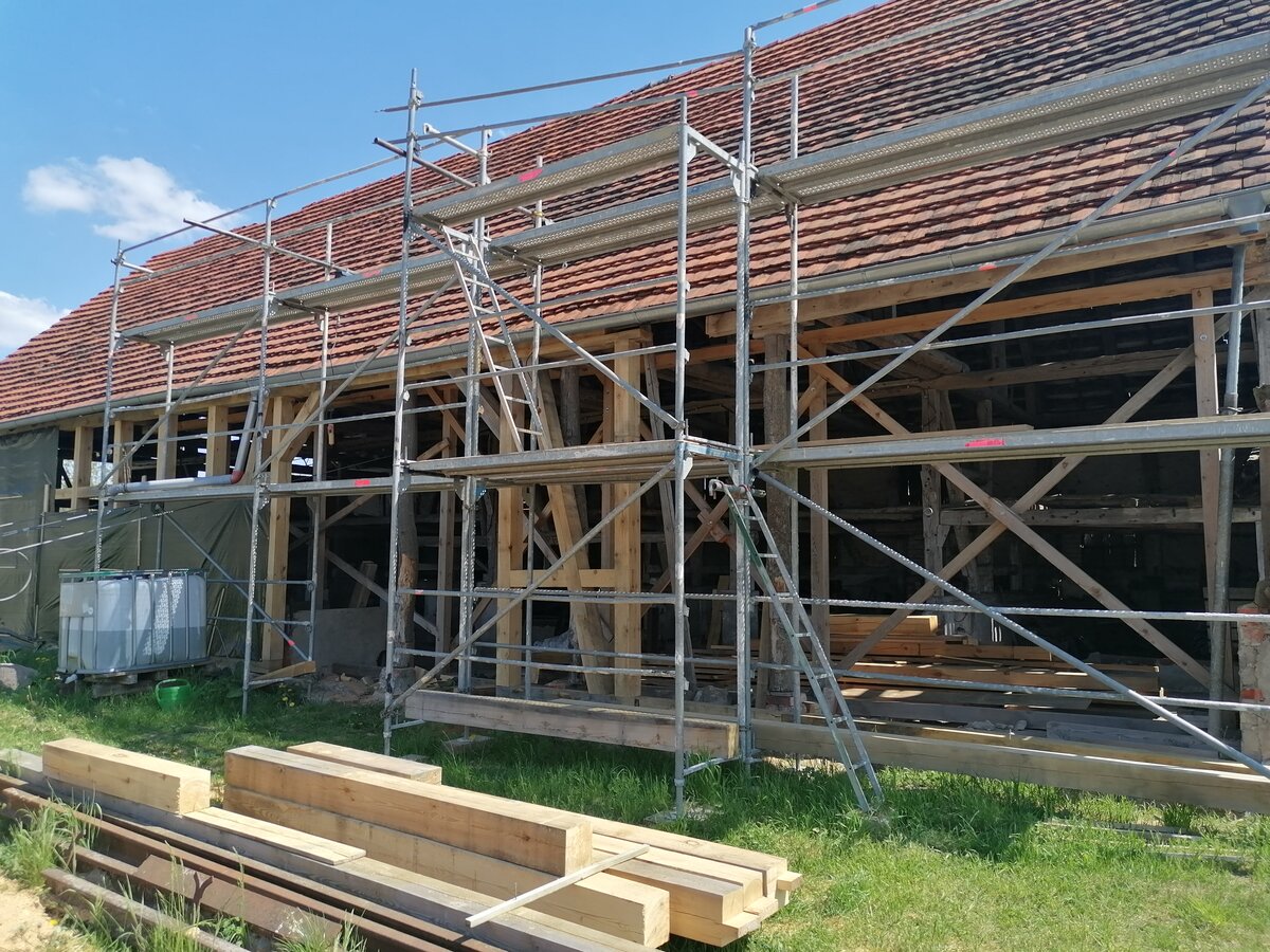 Der Zimmermann arbeitet sich bei der Scheune voran und Andee ihm hinterher. Denn alles was mein lieber Mann macht, kommt in der Rechnung nicht vor. Eine Hälfte ist nun mit Fachwerk ausgebaut, was bedeutet das Gerüst musste von der einen Seite zur anderen wandern und da wieder aufgebaut werden. Gott sei Dank hab ich einen Mann der weiß was er da macht.