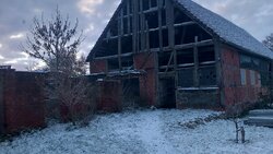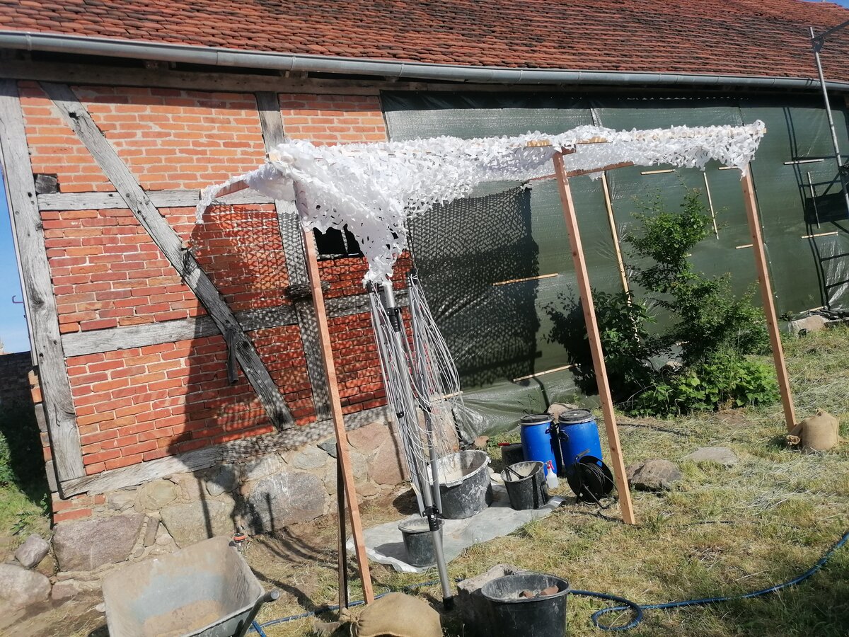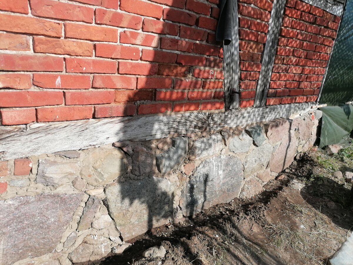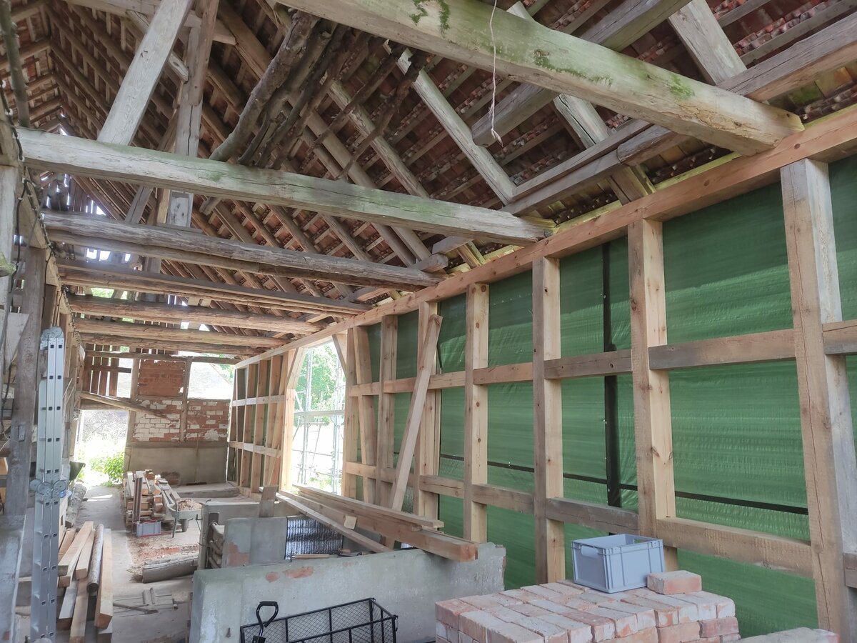 Trommelwirbel…. Es ist vollbracht, der Zimmermann hat unsere Scheune fertiggestellt. Es sieht fantastisch aus und wir sind wahnsinnig zufrieden mit seiner Arbeit. Jetzt geht es mit unserer weiter. Andee hat erst einmal das Feldsteinfundament ausgebessert und ausgefugt um dann Stück für Stück die einzelnen Gefache auszumauern, mit den davor noch gesäuberten Steinen. Wenn ich, wie gerade, aus dem Fenster meines Büros schaue, habe ich beim Anblick der aus dem Dornröschenschlaf erwachenden Scheune ein Lächeln im Gesicht.