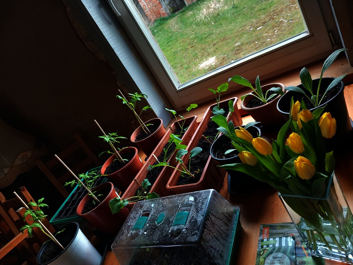 Mit den eingefrorenen Früchteresten setze ich Schnaps an, damit in der Gefriertruhe wieder Platz ist für all das was die Ernte bringen wird. Und damit diese auch gut ausfällt, werden in der Küche schon fleißig Samen vorgezogen.