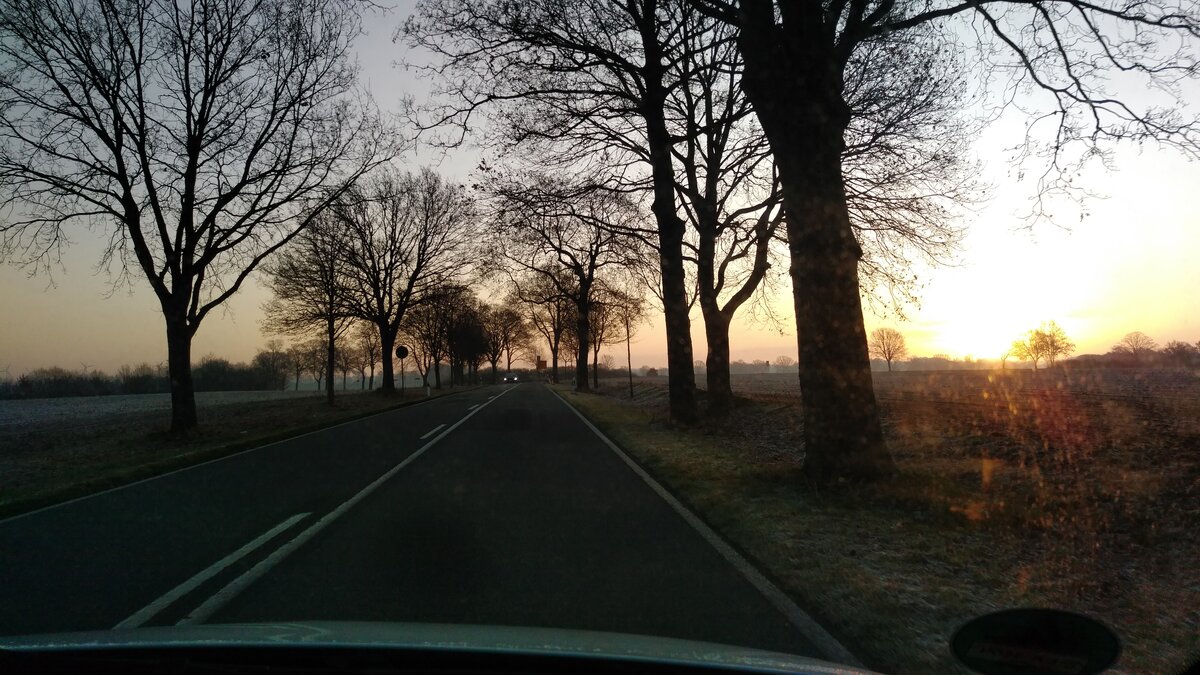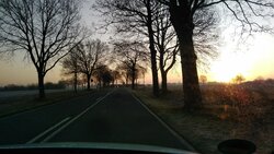 Es ist kurz nach 8 Uhr - wir verlassen gerade die Autobahn und die Weite Brandenburg öffnet sich uns - der Reif hat Wald und Felder wie mit Puderzucker überzogen, am Horizont geht eine riesige orange-gelbe Sonne über dem Tannenwald auf, die Straßen sind leer, die Luft klar und neben uns taucht eine Rehfamilie auf...