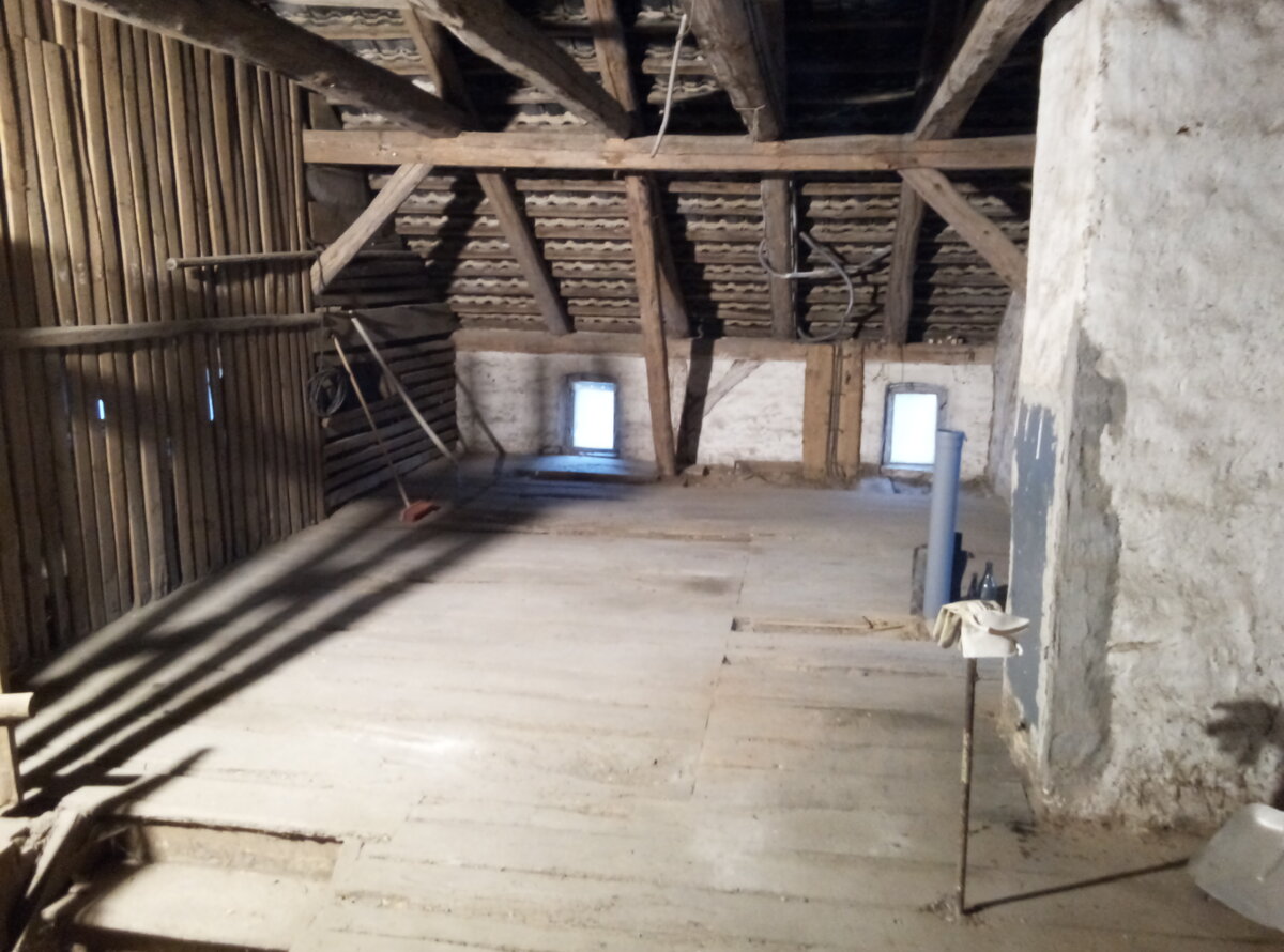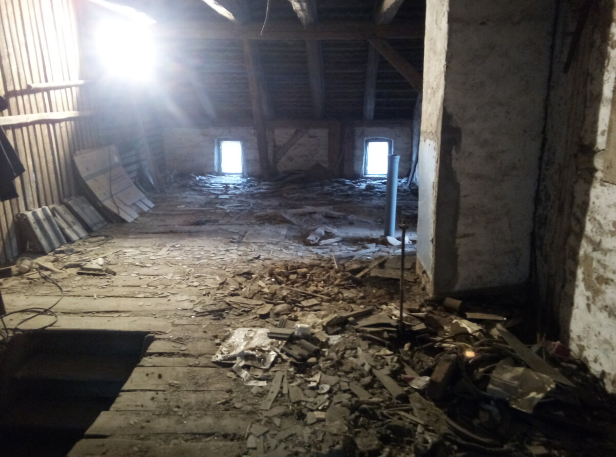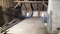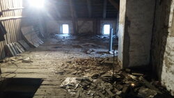 Am nächsten Morgen machen wir uns an die Arbeit - leider regnet es und Andee ändert seinen ursprünglichen Plan - er kümmert sich weiter um den Dachboden - dort ist der komplette Boden mit Dreck, altem Kram und den kaputten Schieferplatten bedeckt.